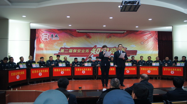 為進一步提高保安隊員綜合素質(zhì)和業(yè)務(wù)技能,檢驗崗位練兵成效,為客戶提供更優(yōu)質(zhì)的服務(wù),全面實現(xiàn)全年各項任務(wù)目標,結(jié)合公司“素質(zhì)提升年”活動的開展,公司組織了此次競賽活動,競賽內(nèi)容涉及《集團概況》、《保安員基礎(chǔ)知識》、《華威企業(yè)文化》、《時事政治及有關(guān)法律法規(guī)》等內(nèi)容,每場比賽分必答、搶答、論述題三個部分。來自集團各分公司、子公司的9支代表隊共27名選手參加了比賽。決賽過程競爭激烈、高潮迭起、精彩紛呈。各代表隊以知識實力論高下、爭第一,以團結(jié)協(xié)作、默契配合提升團體形象,選手們精神飽滿、思維敏捷、沉著應(yīng)答,現(xiàn)場觀眾踴躍參與,主持人幽默、風趣的串詞,為緊張的競賽增添了輕松活躍的氛圍,體現(xiàn)了員工良好的文化素質(zhì)和精神風貌。集團公司董事長、總裁荀金慶、常務(wù)副總裁楊中河、黨總支副書記李曉虎、監(jiān)事會主席米永友、副總裁姚彥偉等公司領(lǐng)導(dǎo)與二百多名員工觀看了比賽。