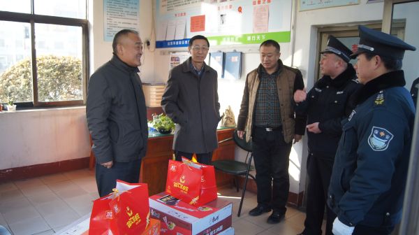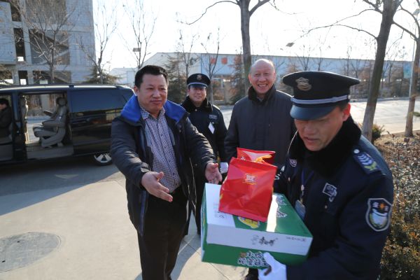 董事長、總裁荀金慶、集團常務(wù)副總裁楊中河、黨總支副書記李曉虎、副總裁顏承國、孫勇、姚彥偉,董事會秘書趙冬梅、總裁助理孔令東、仙文一行首先到集團曲阜分公司、安防公司駐地,看望了值班員工,給大家?guī)砹诵麓旱膯柡颉\鞫麻L、集團副總裁孫勇、姚彥偉,總裁助理孔令東一行驅(qū)車200余公里,分別到菏澤巨野山水水泥有限公司、趙樓煤礦、巨野縣公安局、巨野縣檢察院,兗州巨德機械、萊尼電器、金德物流等華威服務(wù)單位看望慰問了隊員并帶去了節(jié)日慰問品。每到一個執(zhí)勤點,荀董事長都與正在堅守工作崗位的隊員一一握手,送上新年問候,向他們及其家人表達親切的慰問,祝愿大家身體健康、工作順利、家庭幸福、新年快樂!