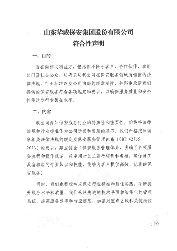 旨在向相關(guān)利益方,包括但不限于客戶、合作伙伴、政府部門及社會公眾,明確表明我公司在保安服務(wù)領(lǐng)域所遵循的法律法規(guī)、行業(yè)標(biāo)準(zhǔn)以及公司內(nèi)部的規(guī)章制度,并鄭重承諾我們提供的保安服務(wù)符合各項(xiàng)規(guī)定和要求,以確保服務(wù)質(zhì)量和安全性能達(dá)到行業(yè)領(lǐng)先水平。