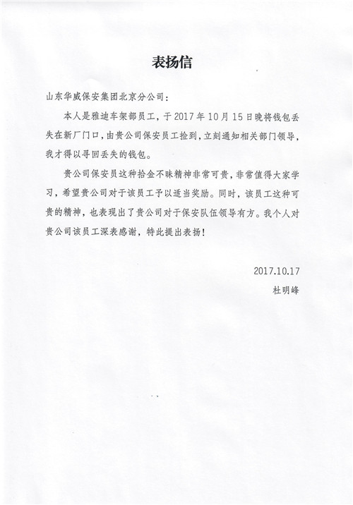 失主接到通知后前來領(lǐng)取,他對保安員表示感謝,立即拿出的100元現(xiàn)金作為酬謝,桑澤銳婉言謝絕說:“這是我們應(yīng)該做的,不是自己的東西不能拿”。兩天后,失主杜明峰又送來表揚(yáng)信,對桑澤銳這種拾金不昧的精神表示感謝。