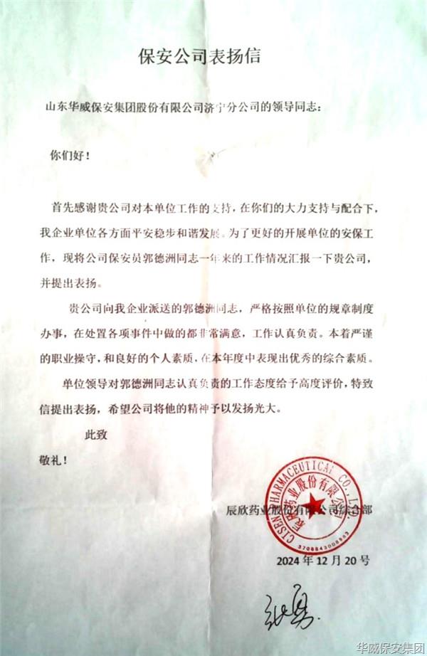 龍影漸遠辭舊歲,吉蛇獻瑞啟新程。新春之際,華威保安濟寧分公司,先后收到了來自客戶辰欣藥業(yè)、煙草公司配送庫的兩封表揚信,對駐勤華威保安團隊、保安隊員郭德洲一年來在...